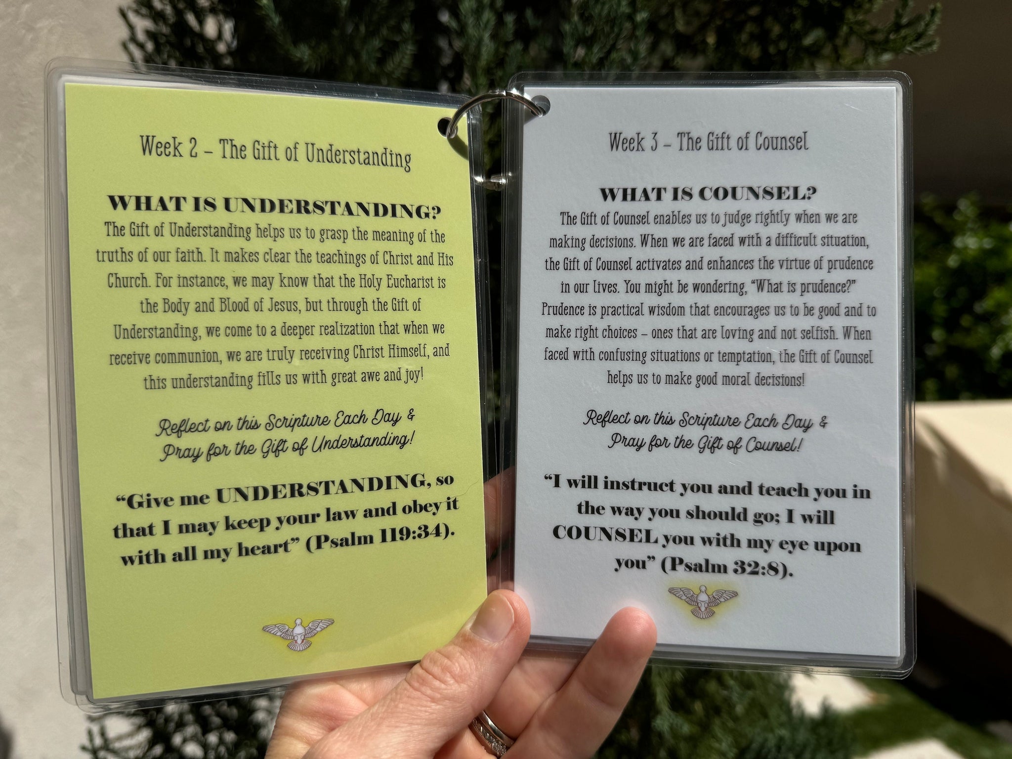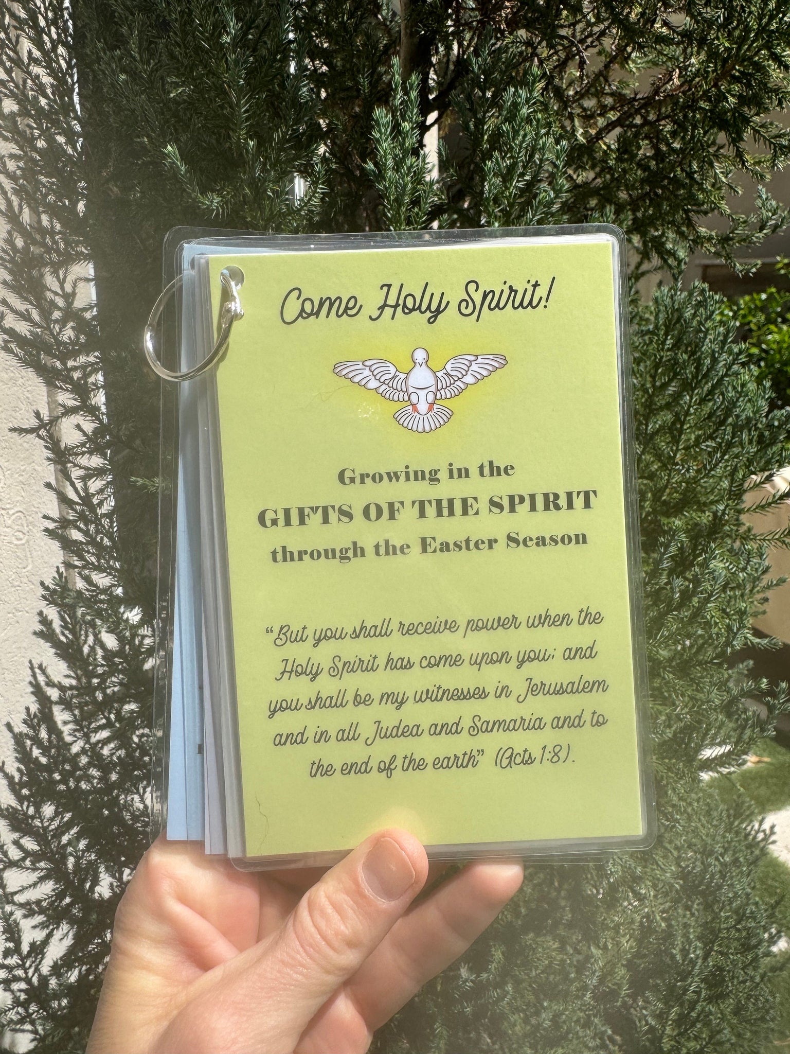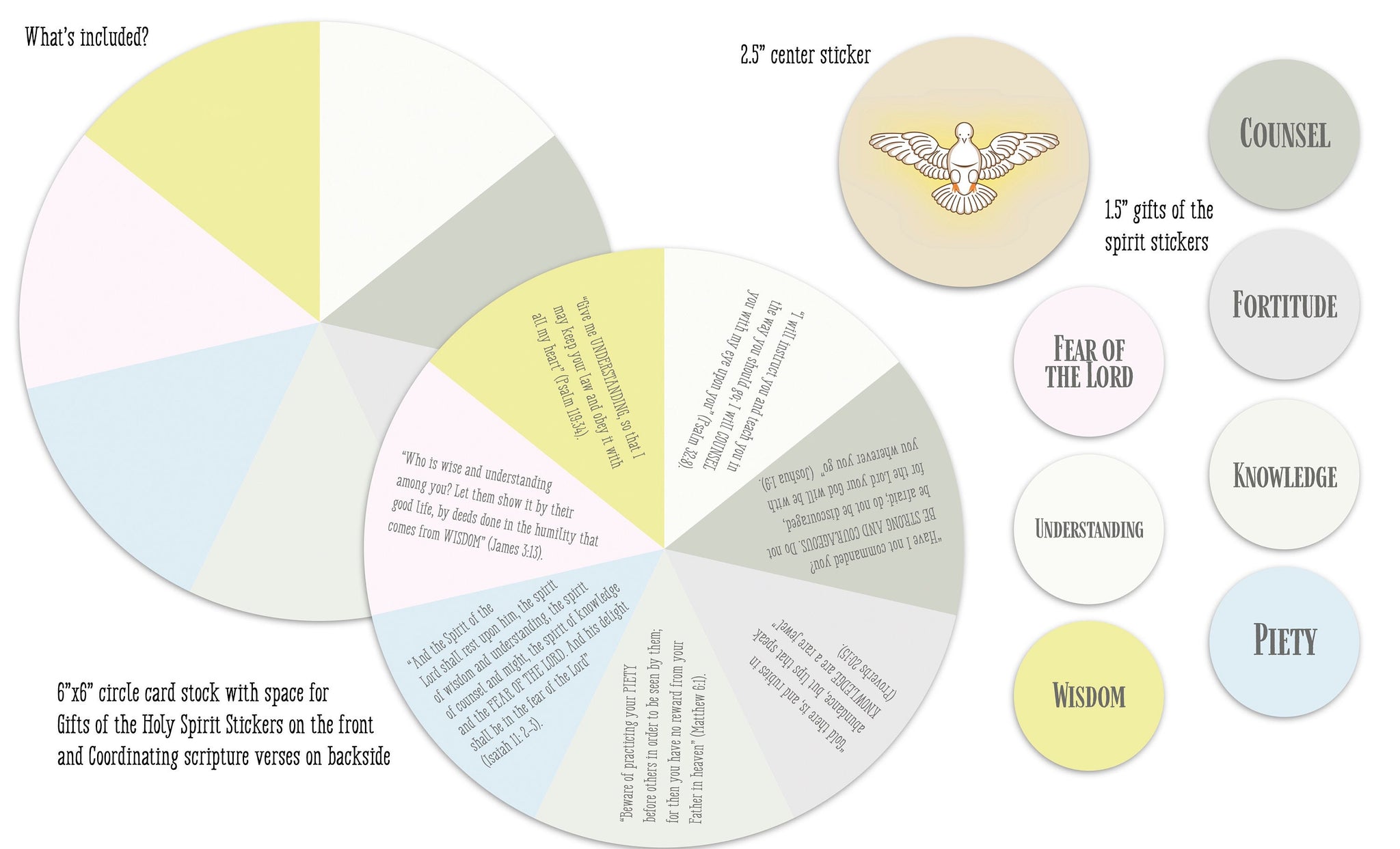 QUANTITY: 1 set of 5 laminated Growing in the Gifts of the Holy Spirit Cards on a keyring along with 1 craft set (craft set includes 1 - 6" circle card with 8 total stickers as seen above) - WHITE CARD HOLDER NOT INCLUDED (it is included in our full Liturgical Living set)