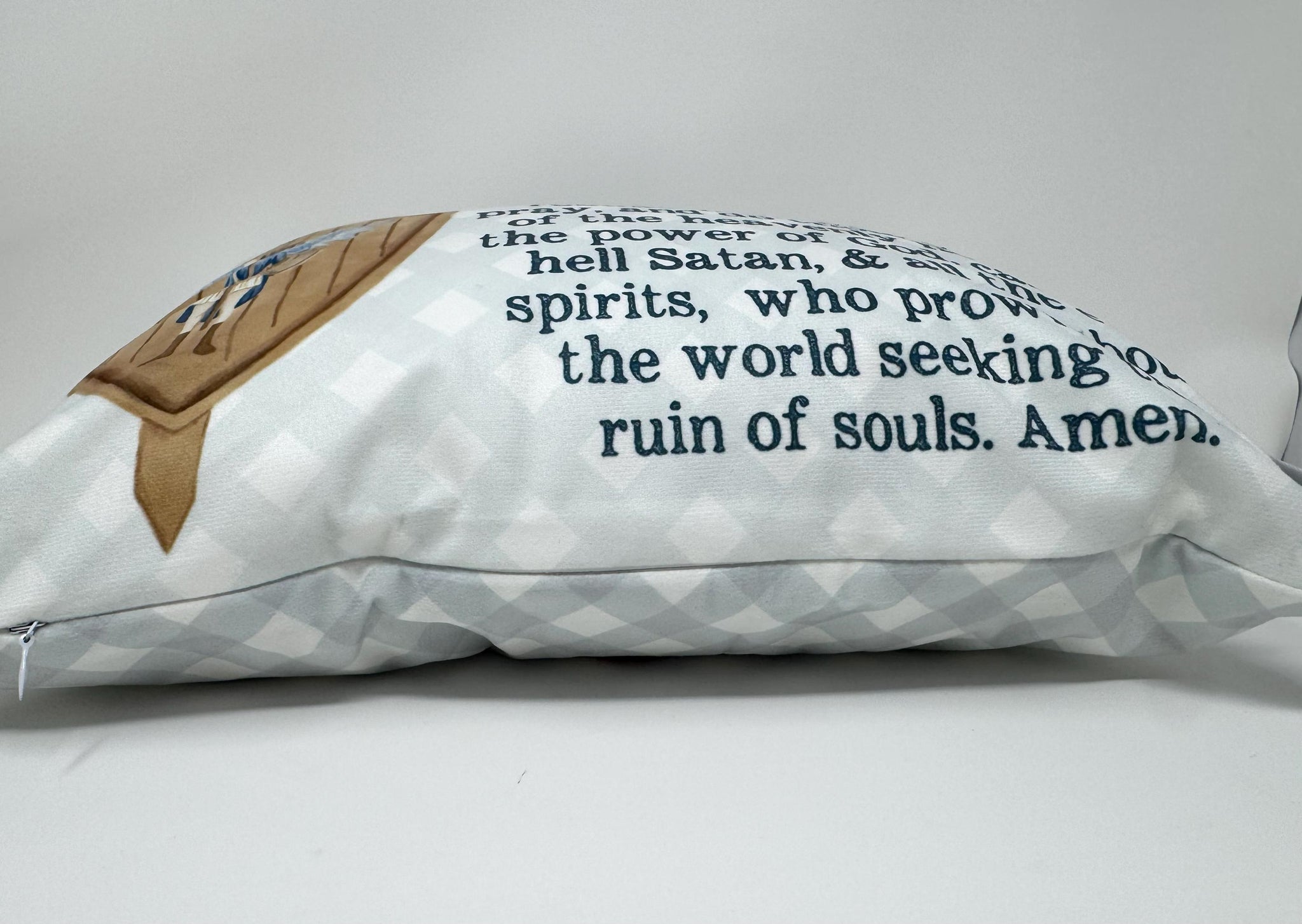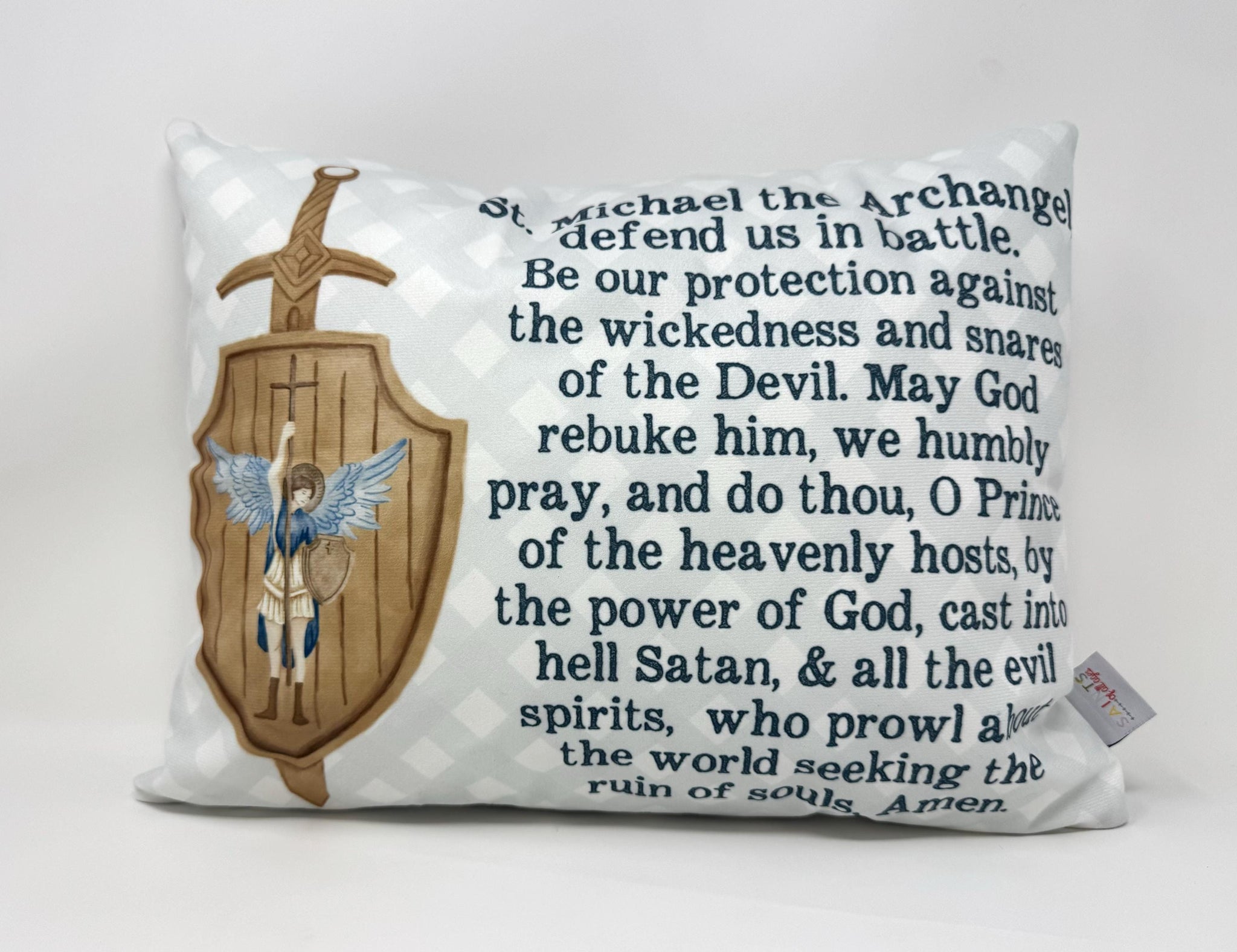What a sweet pillow! Approx. 16x12 ultra soft pillow case with the St. Michael Prayer on one side and gorgeous illustration on reverse.